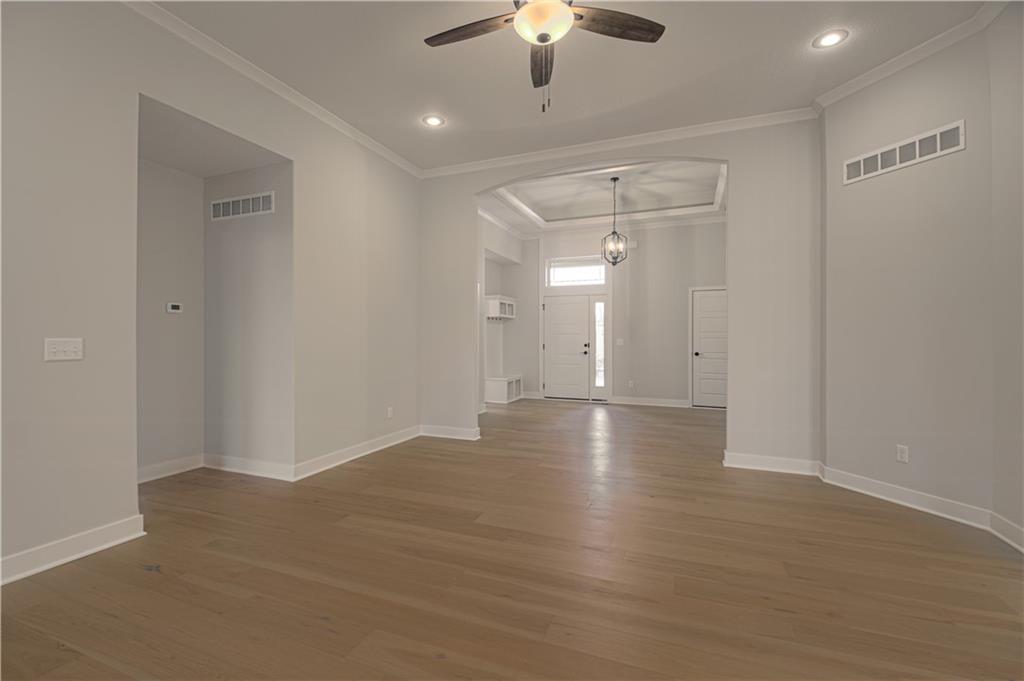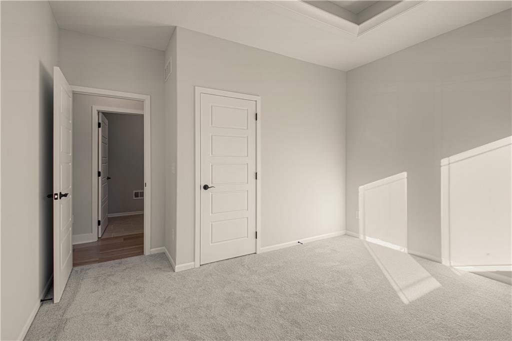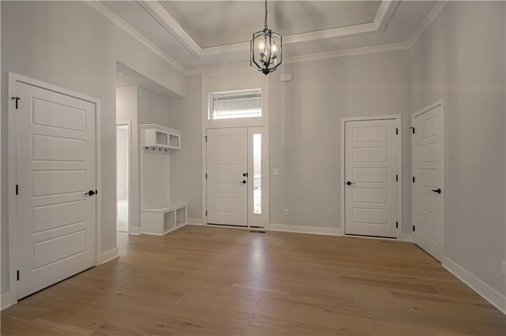 Welcome to the Richmond ranch by Hoffmann Custom Homes, located in the highly sought-after Platte County School District. This thoughtfully designed floor plan offers true main-level living with a private primary suite and ensuite bath, plus two additional bedrooms and a full bathroom. The entry opens to a spacious great room with soaring ceilings and an open-concept kitchen featuring white enameled cabinetry, modern lighting, under-cabinet lighting, a walk-in pantry, and a large quartz island—perfect for everyday living and entertaining. A covered deck sits just off the dining area and backing to trees. Built with durable 2x6 construction and comes with a 10-year structural warranty. The lower level is stubbed for a future bathroom and ready for expansion. This home is move in ready!